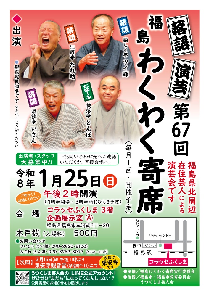 第67回福島わくわく寄席【日時】令和8年1月25日(日)13時30分開場/14時開演【ところ】コラッセふくしま 3階 企画展示室A(福島県福島市三河南町1-20)【出演】裁落亭とんぼ、楽しく亭ツイ輝、酒飲亭いさん、江原亭たれ助【木戸銭】500円